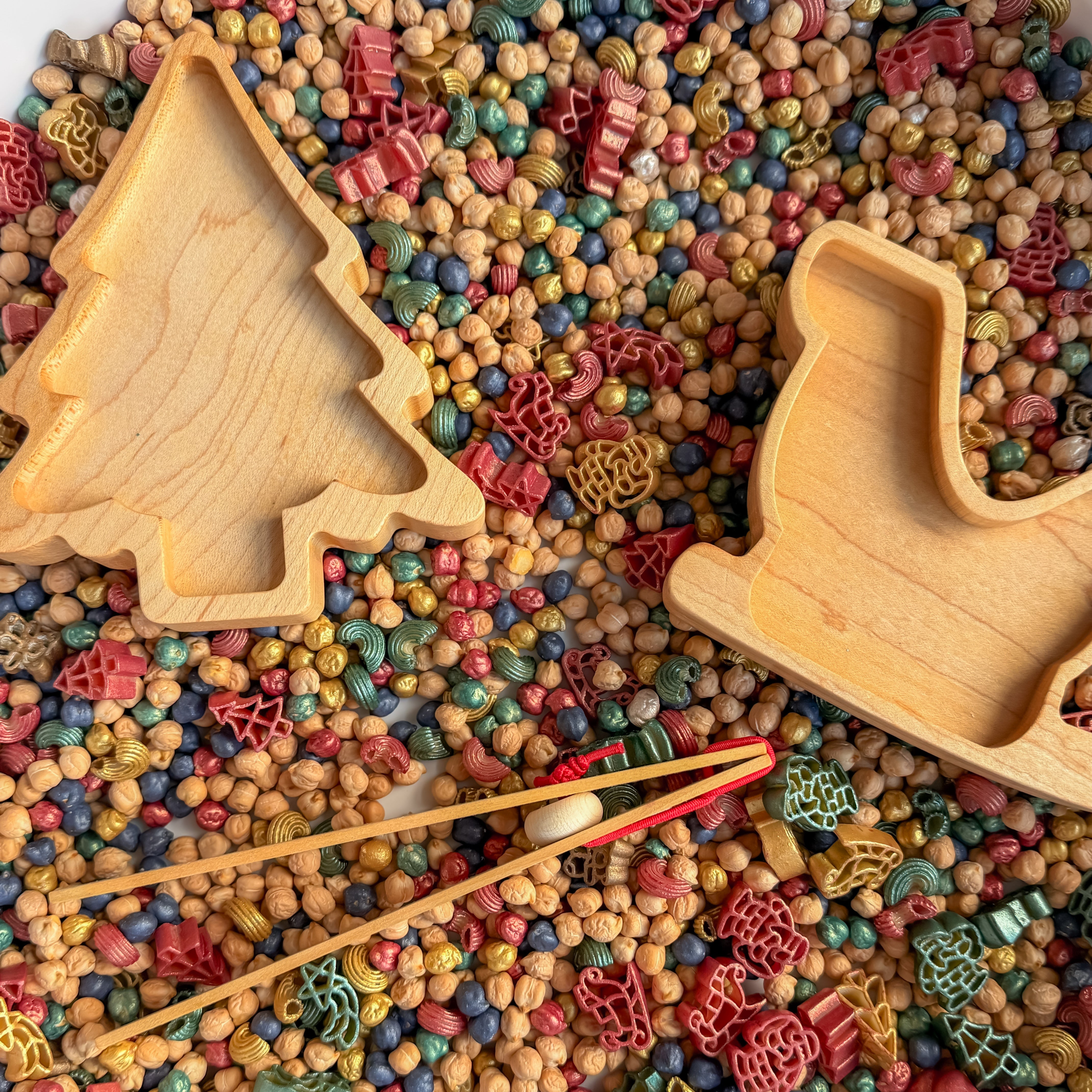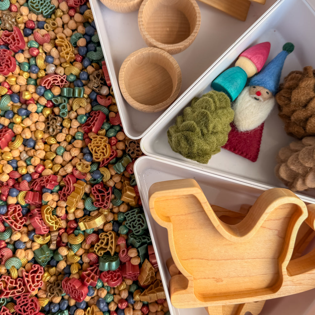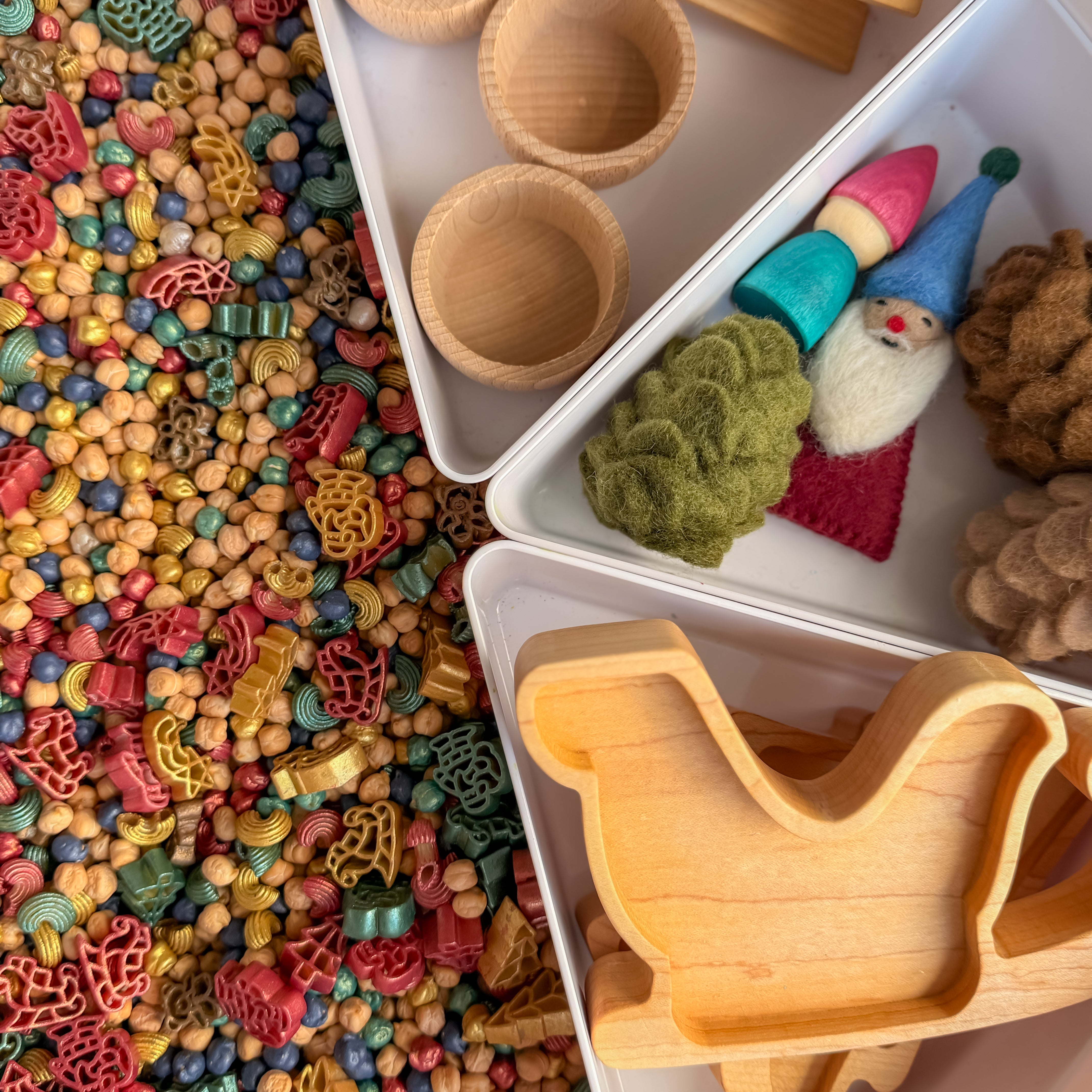 When choosing how much to get, it just depends how “full” looking you like your bin. As an all pasta mix fills the sensory bin a bit differently than an all rice or all chickpea mix.